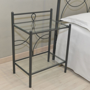 Elegante comodino in ferro battuto con due ripiani in cristallo.