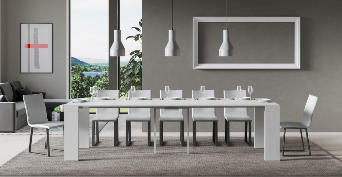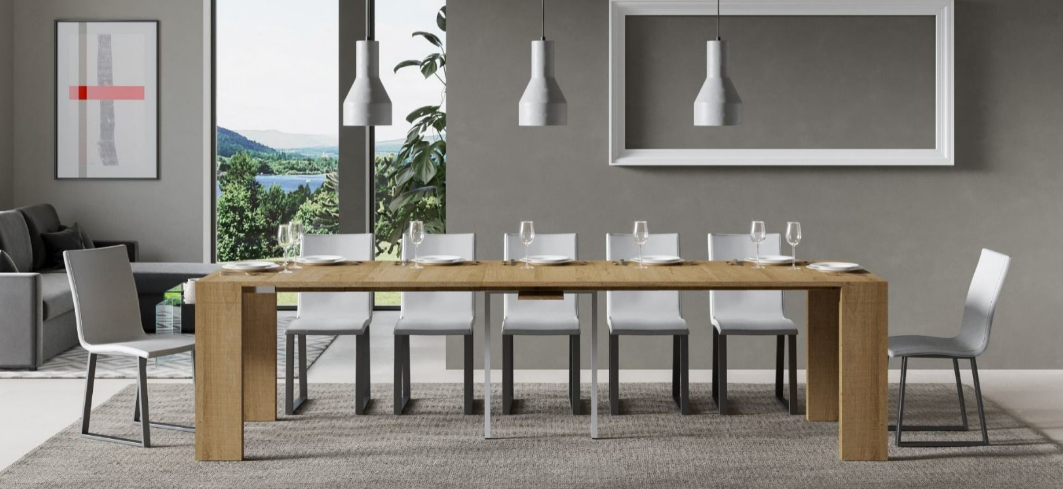Roxell, design, raffinatezza e stile si fondono in questa soluzione d'arredamento dallo spirito moderno e di grandissima versatilità: non solo si inserisce senza problemi in un arredamento contemporaneo e giovanile, ma anche in un ambiente casalingo più classico e tradizionale, grazie alla possibilità di personalizzazione della finitura dell'intera struttura della consolle tra quelle disponibili, che consente di trovare la versione che meglio si abbini al mobilio casalingo. La grande adattabilità si evince anche dalle dimensioni piccole e compatte, in merito alle quali questo complemento d'arredo può essere collocato anche nell'angolo più ristretto di casa: all'ingresso, sotto uno specchio, nel corridoio, in sala da pranzo o nello studio, la consolle allungabile Roxell troverà il proprio spazio senza fare tanta fatica! Le potenzialità di questo modello non finiscono qui: dotato di 5 allunghe, si trasforma in poche mosse in uno spazioso ed estremamente capiente tavolo da pranzo di lunghezza 3m, perfetto per far accomodare fino a 14 persone in tutta comodità. La soluzione ideale per ogni occasione e per ogni esigenza di spazio. Anche alla sua massima estensione, la consolle rimane stabile e robusta, non solo grazie alle gambe solide di cui è munita, ma anche grazie al sistema di supporto a 2 appoggiaterra fornito di serie, che ne garantisce la piena funzionalità.. Disponibile nelle finiture: bianco frassino, quercia natura, noce e cemento. Le allunghe sono della stessa finitura del piano, e misurano 52cm.