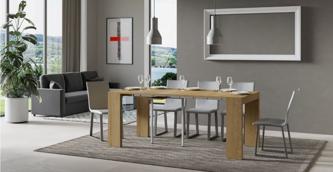 Roxell Small, una consolle allungabile contraddistinta da uno stile lineare, leggero, e snello, che ne conferisce tanta versatilità, una peculiarità che consente a questo complemento d'arredo di inserirsi facilmente in qualsiasi stile d'arredamento pre-esistente in casa, nonché in qualsiasi angolo, anche quello più piccolo e ristretto: all'ingresso, nel corridoio, in cucina, in camera da letto o nello studio, la consolle allungabile Roxell Small saprà conquistarsi il proprio spazio senza alcuna fatica! Dotata di un sistema a tre allunghe, si estende progressivamente a 196 cm, trasformandosi in poche mosse in un pratico tavolo da pranzo: organizzare pranzi e cene in compagnia, o improvvisare una tavolata di amici e parenti non sarà più un problema! Anche alla sua massima estensione, la consolle rimane stabile e robusta, non solo grazie alle gambe solide di cui è munita, ma anche grazie al sistema di supporto a 2 appoggiaterra fornito di serie, che ne garantisce la piena funzionalità.
