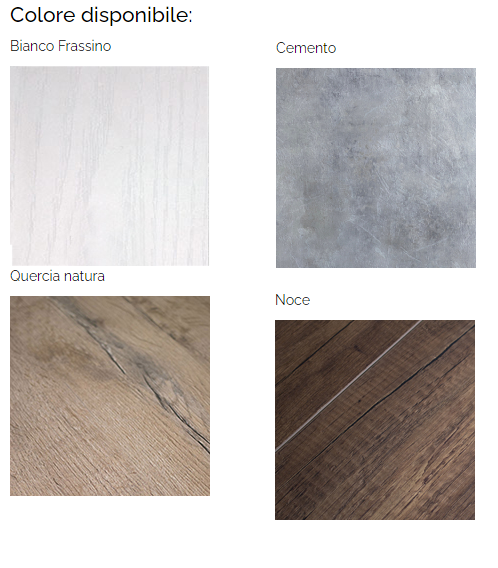 Disponibile nelle finiture: bianco frassino, quercia natura, noce e cemento. Le allunghe sono della stessa finitura del piano, e misurano 52cm.