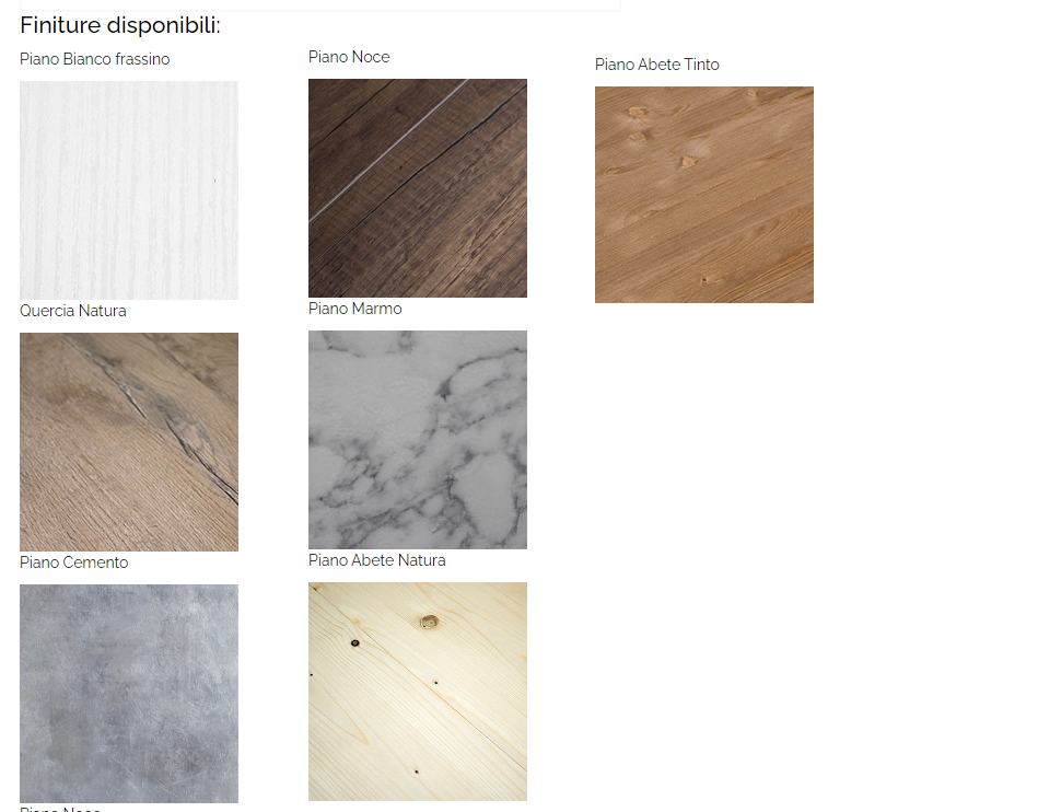 Il piano e le allunghe, nelle finiture bianco frassino, quercia natura, cemento, noce, marmo sono in microparticelle di legno rivestito, mentre il piano in abete natura e abete tinto è in legno listellare. Le allunghe sono nella stessa finitura del piano.