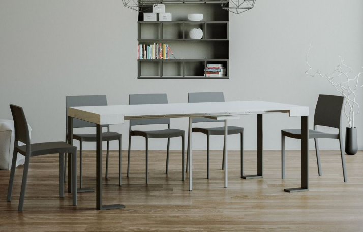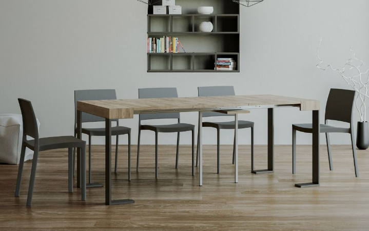 Tavolo / consolle allungabile modello Tecno, un concentrato di eleganza, stile, versatilità e design. In puro stile moderno, questa consolle può essere inserita in qualsiasi ambiente della casa, dall'ingresso alla camera da letto. La solidità della struttura il ferro con il piano in legno lavorato a Folding, rende la consolle robusta e stabile