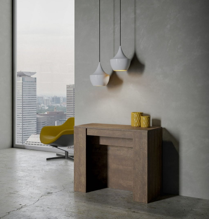 Consolle realizzata in nobilitato melaminico. Possibilità di scelta tra tre finiture, bianco frassino, noce e antracite spatolato.