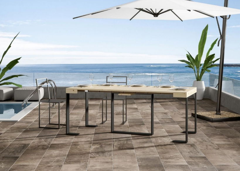 Viola Small, una consolle allungabile da giardino, elegante e versatile. Perfetta per arredare con gusto ambienti esterni, si adatta ad ogni stile di arredamento. Dotata di un sistema a tre allunghe, si estende progressivamente fino a 190 cm, trasformandosi in un pratico e comodo tavolo da pranzo. Un solido telaio in metallo regge un raffinato piano in legno di abete, una combinazione che rende la consolle estremamente affidabile anche quando allungata al massimo. Il telaio in ferro è disponibile nella versione verniciata grigio antracite. Made in Italy Caratteristiche tecniche: Piano in legno listellare d'abete lavorazione tipo folding (adatto per l'esterno) Allunghe in listellare d'abete semplici (adatte per l'esterno) Il legno con il quale è stata costruita la consolle (abete) è massello 100% naturale. Eventuali piccole imperfezioni sono da ritenersi caratteristiche intrinseche del materiale stesso e della lavorazione artigianale, e quindi perfettamente normali; anche il colore, nel tempo, se esposto alle intemperie o esposto alla luce diretta del sole, potrebbe subire leggere variazioni, anche queste variazioni sono assolutamente normali. E' possibile che si verifichi una leggera discrepanza tra il colore del piano e quella delle allunghe, dovuta al fatto che il piano è sempre esposto alla luce del sole, mentre le allunghe vengono in genere utilizzate meno di frequente. E' possibile che una leggera differenza si verifichi anche a contatto con la luce durante la permanenza nel nostro magazzino.