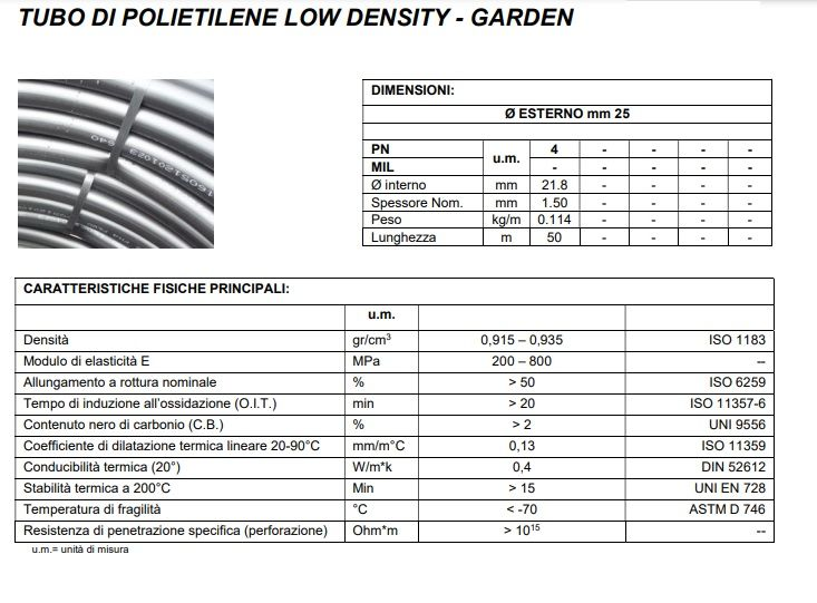 Tubo consigliato solamente per gli impianti a goccia in bassa pressione. Rotolo da 50 metri. L'ottima maneggevolezza lo rende indicato per l'utilizzo negli impianti d'irrigazione sia interrati che esterni. Discreta flessibilità, resistenza alla pressione e resistenza chimica si fondono con bassa resistenza all'abrasione, limitato range di temperature di impiego e bassa resistenza alla trazione.