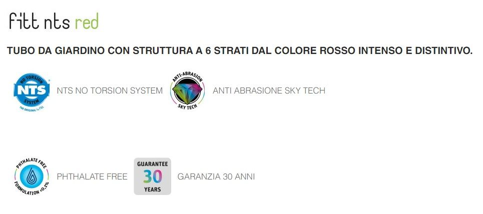 Tubo con struttura a 6 strati con interno rosso, strato nero anti-alga, strato intermedio rosso, rinforzo tessile NTS, copertura esterna trasparente, pellicola SKY TECH con speciale formulazione anti-UV che previene l’invecchiamento del tubo e che conferisce una particolare finitura satinata. L’estetica del tubo è resa ancora più accattivante grazie ad un nuovo, particolare design. Grazie alla maglia NTS, unica ed originale, NTS è un tubo che offre una grande malleabilità, impedendo la formazione di nodi e di torsioni, garantendo un flusso d’acqua costante. La tecnologia SKY TECH aumenta la resistenza a tagli ed abrasioni e rende il tubo estremamente scorrevole e facile da gestire permettendogli di scivolare su tutte le superfici, anche negli angoli.