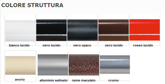 Colori struttura: Alluminio Satinato, Avorio, Bianco Lucido, Cromo, Marrone Lucido, Nero Lucido, Nero Opaco, Rame Maculato, Rosso Lucido