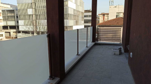 Materiale su commissione, di tempi di consegna possono variare di 4/5 ggCaratteristiche: Parapetto balaustra vetro/metallo da abbinare con relative piantane H 1050 da pavimento realizzata come segue: montanti in 50*50*3 in acciaio zincato verniciati a polveri finitura RAL ( da scegliere ) con relativi morsetti per vetro in zamac finitura inox satinato; lastre di vetro float 55.4 stratificato e temperato. Certificazione di prova resistenza al carico statico orizzontale ( D.M. 14.01.2008 – tabella 3.1.II Cat. F; UNI 10806:1999 )