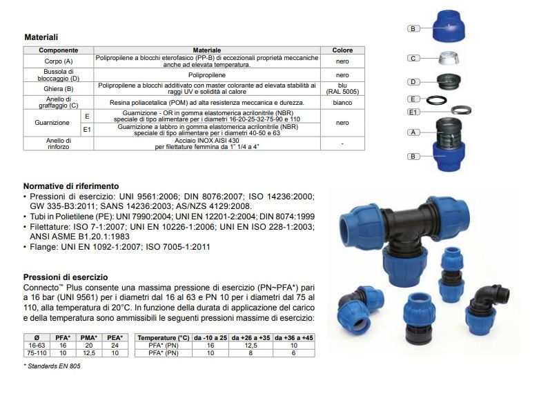 - Pressioni di esercizio: UNI 9561:2006; DIN 8076:2007; ISO 14236:2000; GW 335-B3:2011; SANS 14236:2003; AS/NZS 4129:2008.
