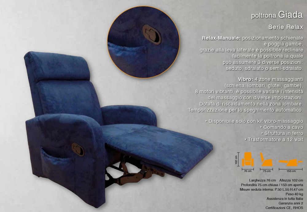 Poltrona reclinabile manualmente, design raffinato, si adatta alle proprie esigenze grazie alle varie posizioni di reclinazione, kit vibro massaggiante e riscaldamento: 8 motori per vibromassaggio, 8 Programmi di massaggio, 3 intensità, spegnimento automatico; timer da 10 a 30 minuti.