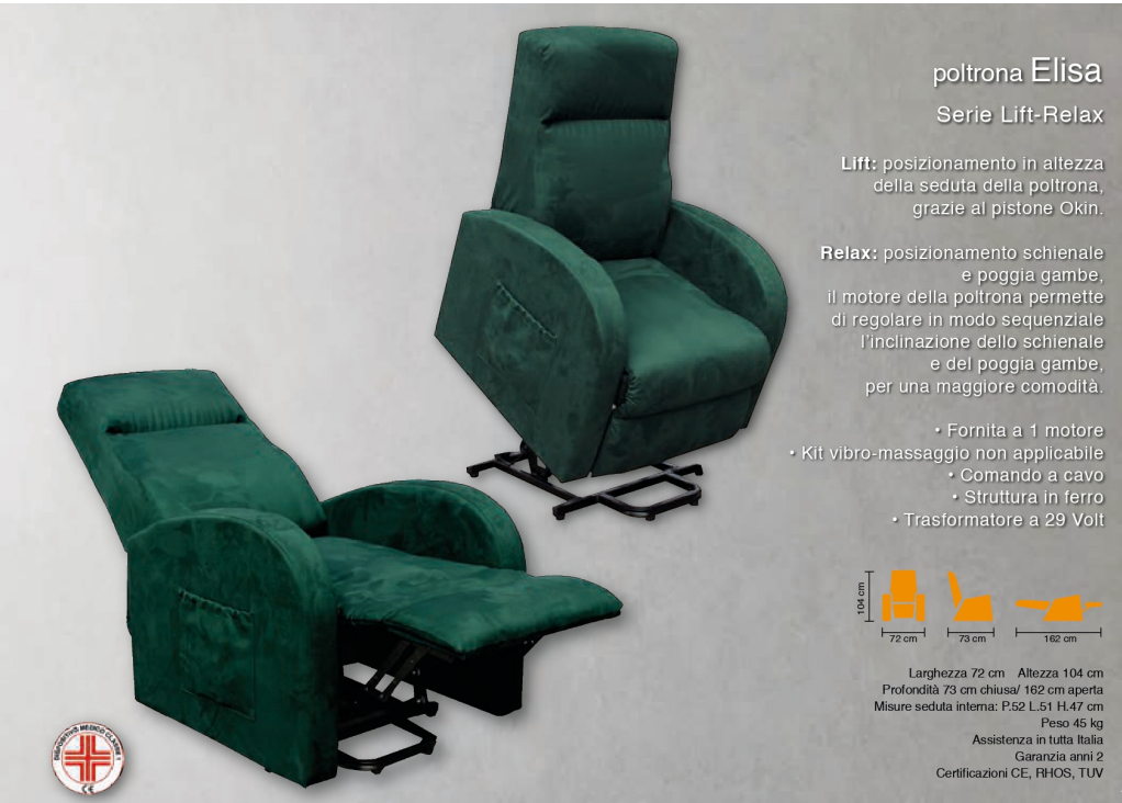 Lift: posizionamento in altezza della seduta della poltrona grazie al pistone Okin. Relax: posizionamento schienale e poggia gambe, il motore della poltrona permette di regolare in modo sequenziale l'inclinazione dello schienale e del poggia gambe, per una maggiore comodità. - Fornita ad 1motore - Kit vibro-massaggio non applicabile - Comando a cavo - Struttura in ferro - Trasformatore a 29 Volt.