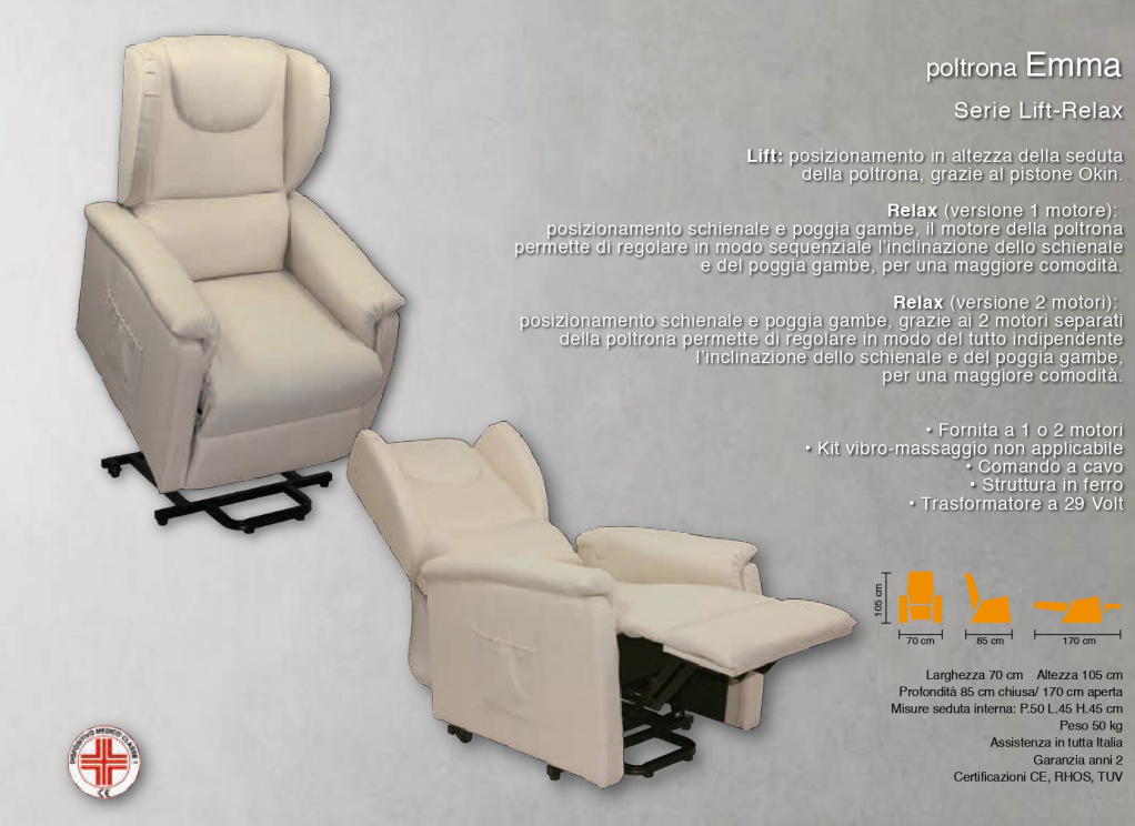 Lift: posizionamento in altezza della seduta della poltrona grazie al pistone Okin. Relax: posizionamento schienale e poggia gambe, nella versione ad 1 motore il pistone della poltrona permette di regolare in modo sequenziale l'inclinazione dello schienale e del poggia gambe mentre nella versione a 2 motori i 2 pistoni separati della poltrona permettono di regolare in modo del tutto indipendente l'inclinazione dello schienale e del poggia gambe (reclinazione a 180° "posizione letto") - Fornita ad 1 motore e a 2 motori - Seduta sfoderabile - Kit vibro-massaggio non applicabile - Comando a cavo - Struttura in ferro - Trasformatore a 29 Volt. - Dotata di 2 rotelle posteriori.
