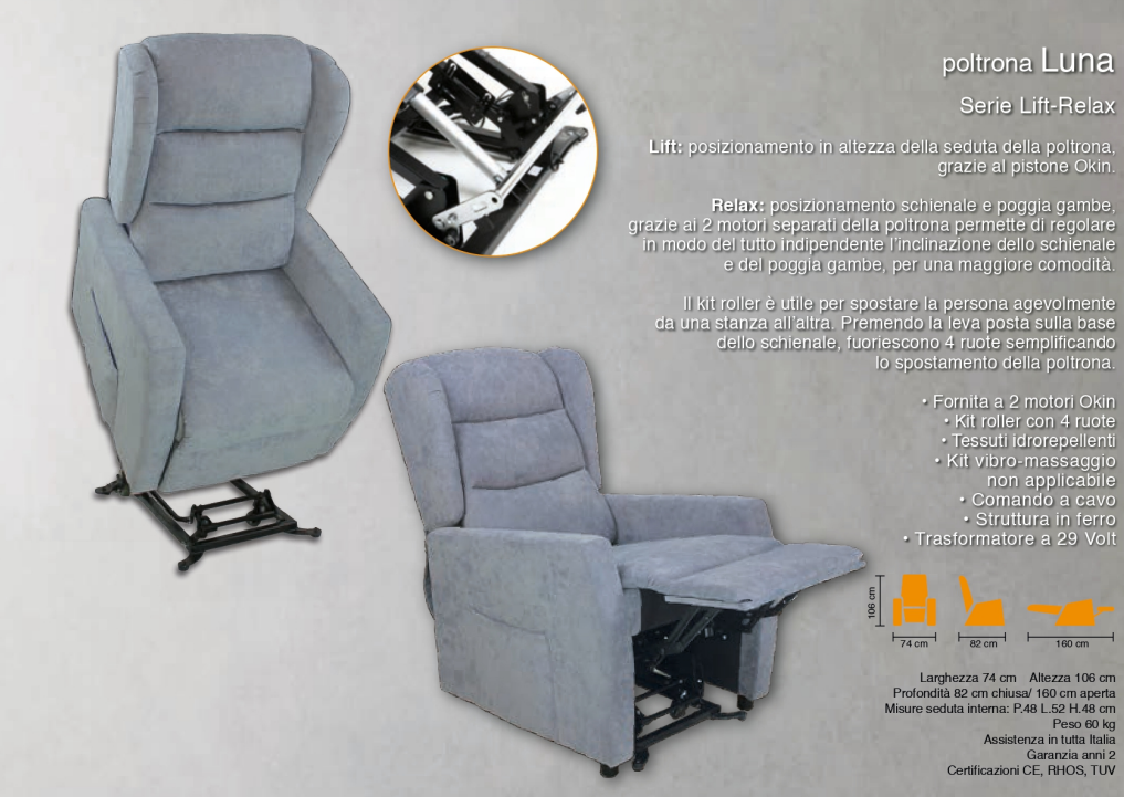 Lift: posizionamento in altezza della seduta della poltrona, grazie al pistone Okin supporta un'alzata massima di 150 kg. Relax: posizionamento schienale e poggia gambe, grazie ai 2 motori separati della poltrona permette di regolare in modo del tutto indipendente l’inclinazione dello schienale e del poggia gambe, per una maggiore comodità.