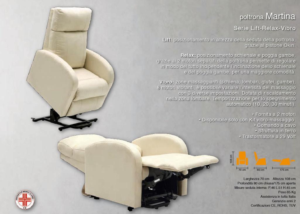 Lift: posizionamento in altezza della seduta della poltrona, grazie al pistone Okin supporta un'alzata massima di Kg. 170. Relax: posizionamento schienale e poggia gambe, grazie ai 2 motori separati della poltrona permette di regolare in modo del tutto indipendente l'inclinazione dello schienale e del poggia gambe, per una maggiore comodità. Vibro: 4 zone massaggianti (schiena, lombari, glutei, gambe), 8 motori vibranti, è possibile variare l'intensità del massaggio con 3 diverse impostazioni. Dotata di Riscaldamento nella zona lombare. Temporizzazione per lo spegnimento automatico (10, 20, 30 minuti) - Dotata di 2 rotelle posteriori - Fornita a 2 motori - Comando a cavo - Struttura in ferro - Trasformatore a 29 Volt.