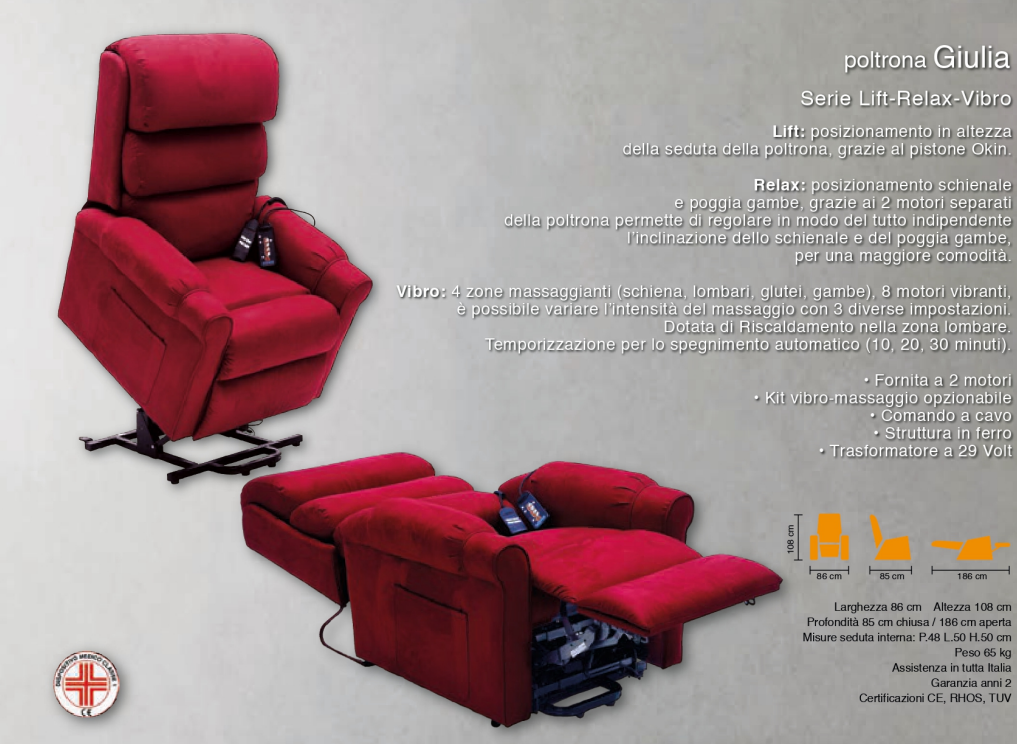 Lift: posizionamento in altezza della seduta della poltrona, grazie al pistone Okin supporta un'alzata massima di Kg. 170. Relax: posizionamento schienale e poggia gambe, grazie ai 2 motori separati della poltrona permette di regolare in modo del tutto indipendente l'inclinazione dello schienale e del poggia gambe, per una maggiore comodità. Vibro: 4 zone massaggianti (schiena, lombari, glutei, gambe), 8 motori vibranti, è possibile variare l'intensità del massaggio con 3 diverse impostazioni. Dotata di Riscaldamento nella zona lombare. Temporizzazione per lo spegnimento automatico (10, 20, 30 minuti) - Dotata di 2 rotelle posteriori - Fornita a 2 motori - Comando a cavo - Struttura in ferro - Trasformatore a 29 Volt.
