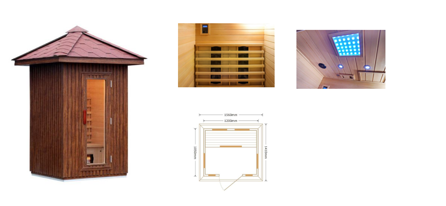 Sauna ad infrarossi 2 posti da esterno full optional ad infrarossi è studiata per chi vuole godersi la propria sauna all' aperto infatti questa sauna ad infrarossi da esterno è costruita per resistere alle intemperie grazie al trattamento da esterno e il tetto spiovente, può essere posizionata su giardini o terrazze.