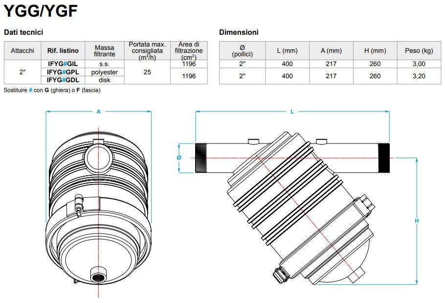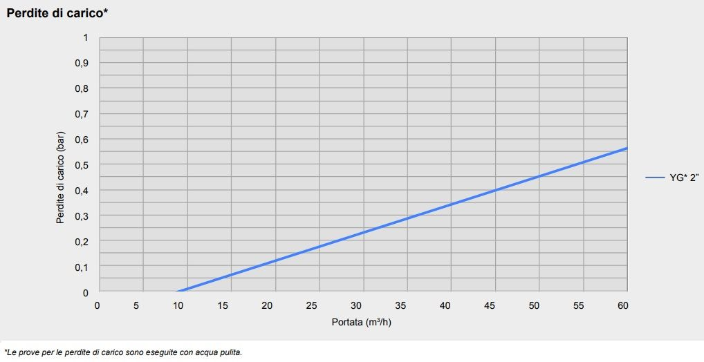 - Pressione di esercizio massima: 8 bar a 20° - Grado di filtrazione standard: 120 mesh - Derivazione standard: filettro mascio [BSP e NPT] - Portata: 25,00 m3/h