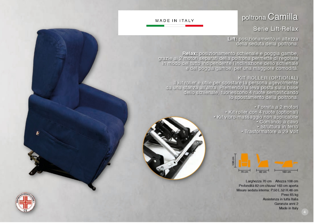 Lift: posizionamento in altezza della seduta della poltrona. Relax: posizionamento schienale e poggia gambe, grazie ai 2 motori separati della poltrona permette di regolare in modo del tutto indipendente l'inclinazione dello schienale e del poggia gambe, per una maggiore comodità. Fornita a 2 motori - KIT ROLLER - Kit Vibro-massaggio non applicabile - Comando a cavo - Struttura in ferro - Trasformatore a 29 Volt.