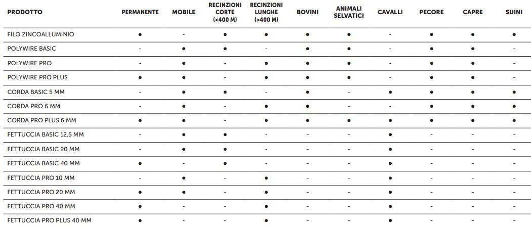 Il seguente prodotto appartiene alla famiglia dei conduttori. Quest'ultimi hanno un ottimo rapporto qualità prezzo e sono adatti per soddisfare ogni esigenza di recinzione elettrica, sia mobile che permanente. Tutti i conduttori sono resistenti ai raggi UV e le caratteristiche di conducibilità e resistenza alla trazione sono ideali per realizzare recinzioni elettriche efficaci. I prodotti Pro Plus, ad alta conducibilità, sono particolarmente consigliati per lunghe recinzioni in quanto assicurano, grazie ai conduttori di rame, un ottimo flusso di corrente fino alla fine della recinzione. La seguente tabella (vedi in basso)aiuta a capire quale è il conduttore consigliato per le diverse situazioni.