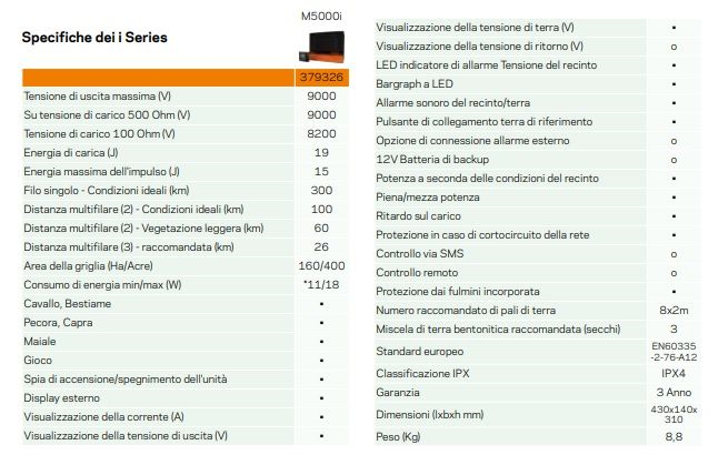 Il M5000i è l’ultimo elettrificatore, più potente della i Series. Questo apparecchio intelligente offre una capacità sufficiente per recinzioni fino a 100 km. L’eccezionale display esterno esclusivo ti garantisce di operare e leggere le indicazioni dell’elettrificatore da una distanza di 50 metri. L’elettrificatore può essere utilizzato e ampliato con tutti gli elettrificatore i Series. Soluzione perfetta per le recinzioni elettrificate nel settore dell'allevamento e della zootecnia, con un eccellente rapporto qualità-prezzo. Caratteristiche