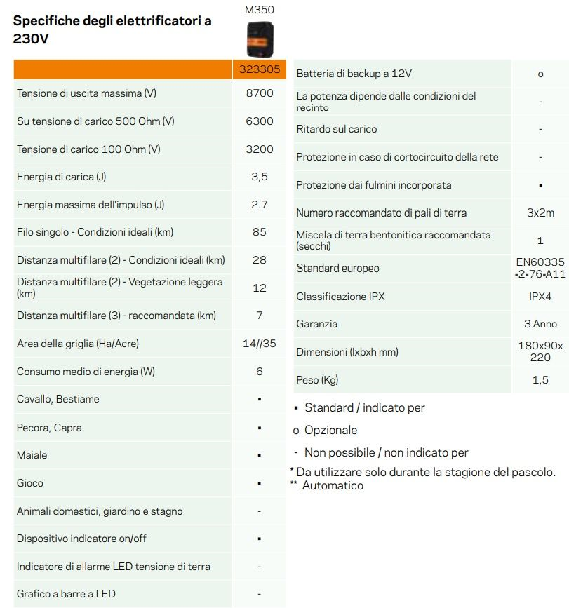 Il più piccolo elettrificatore a corrente di rete nella serie Special edition. Questo elettrificatore offre un rapporto qualità/prezzo eccezionale. L’M350 offre una potenza sufficiente per elettrificare recinzioni fino a 28 km. L’elettrificatore è dotato di una struttura esterna robusta con LED di accensione e parafulmine. Soluzione perfetta per le recinzioni elettrificate nel settore dell'allevamento e della zootecnia, con un eccellente rapporto qualità-prezzo. Caratteristiche