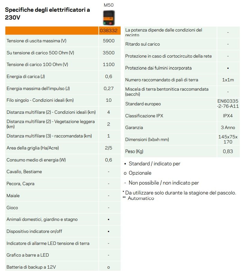 N.B. La flora ha una notevole influenza sulla massima lunghezza che un erogatore elettrico riesce a raggiungere sulla recinzione. Più vegetazione comporta più carica accumulata sul recinto, diminuendone la portata. Le indicazioni sulla lunghezza della recinzione si riferiscono a materiale (fili e connettori) con ottima conduzione,buoni isolatori,un sistema di messa a terra ottimale e scarsa vegetazione al suolo.