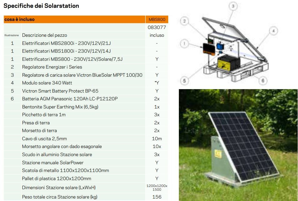 - Elettrificatore MBS800 - Regolare di carica solare Victron BlueSolar MPPT 100/30 - Modulo solare 340 Watt - Victron Smart Battery Protect BP-65 - 2x Batteria AGM Panasonic 120Ah LC-P12120P - 1x Bentonite Super Earthing Mix (6,5 Kg) - 3x Picchetto di messa a terra 1 m - 2x Presa di terra - 2x Morsetto di terra - 10 m Cavo di uscita 2,5 mm - 10x Morsetto angolare con dato esagonale - 3x Scudo in alluminio Stazione solare - Manuel Stazione Solarpower - Scatola di metallo 1100x1200x1100 mm - Pallet di plastica 1200x1200 mm
