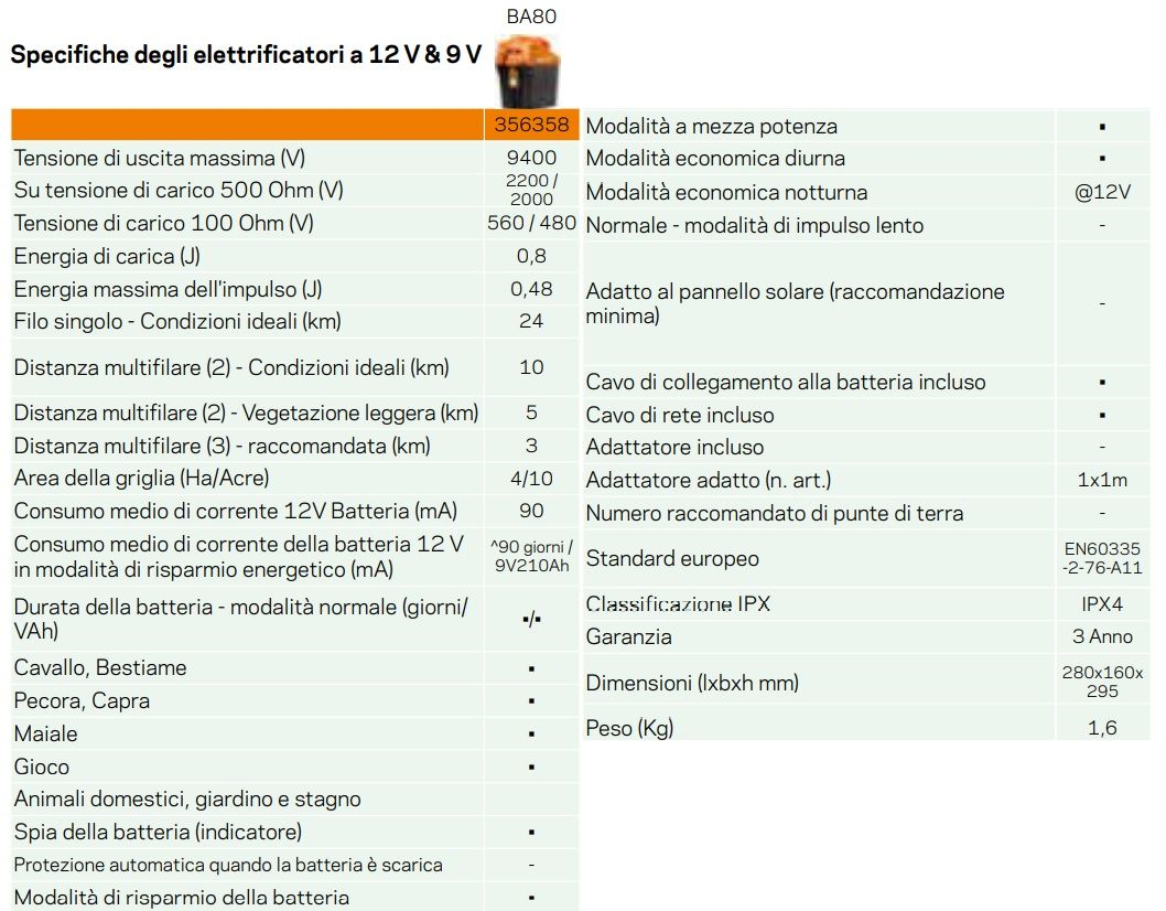 BA80 è il dispositivo a batteria più potente della serie BA indicato per recinzioni fino a 10 km. Questo elettrificatore presenta 2 diverse posizioni. Nella posizione 1 il dispositivo fornisce un impulso standard con il massimo di Joule. Nella seconda posizione eroga un impulso al 100% seguito da 3 impulsi al 50%. Questo fa sì che la batteria duri più a lungo e che sulla recinzione sia presente una corrente sufficiente. La batteria non è inclusa.Soluzione perfetta per le recinzioni elettrificate nel settore dell'allevamento e della zootecnia, con un eccellente rapporto qualità-prezzo. Caratteristiche