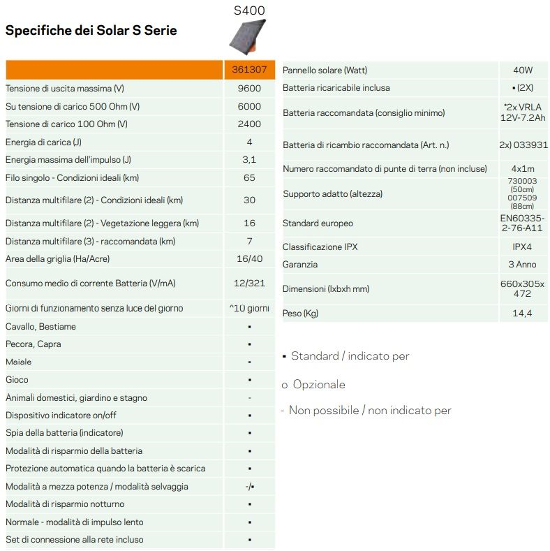 L’S400 è l’apparecchio più potente tra i dispositivi solari. Con l’S400 è possibile elettrificare una recinzione lunga fino a 30 km. L’S400 dispone di un potente pannello solare da 40W. Grazie al sistema smart battery management incorporato l’elettrificatore è in grado di funzionare senza luce diurna per un numero maggiore di settimane. In questo modo la recinzione sarà alimentata in ogni stagione dell’anno. Viene fornito con picchetto di supporto (50 cm) utilizzabile anche come picchetto di terra supplementare. Soluzione perfetta per le recinzioni elettrificate nel settore dell'allevamento e della zootecnia, con un eccellente rapporto qualità-prezzo.