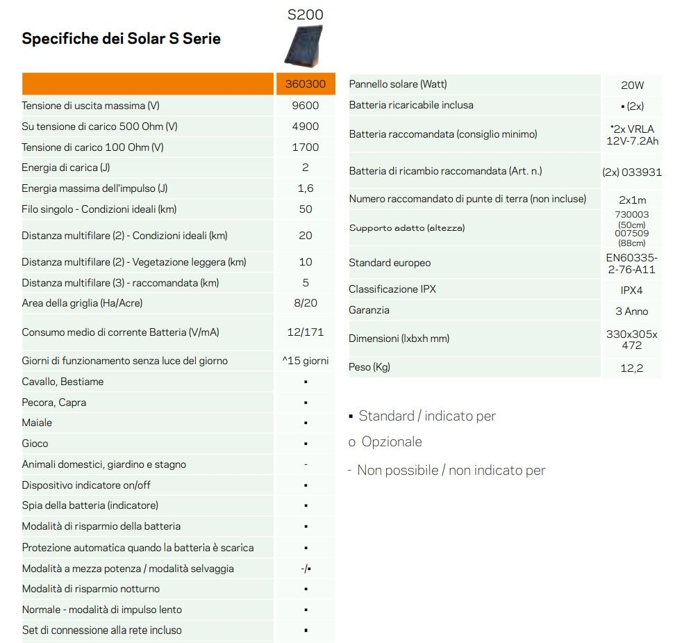 L’S200 è un apparecchio solare per recinzioni mobili o semi permanenti lunghe fino a 20km. L’S200 dispone di un funzionale pannello solare da 20W. Facile e semplice da installare, è dotato di funzioni per la gestione della batteria che consentono all’apparecchio di funzionare a lungo anche senza luce.