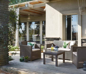 Set da terrazzo per interno/esterno ideale anche per giardini e spazi di intrattenimento. Elementi d'arredo eleganti e sofisticati, con trama piatta in stile rattan resistente e duratura.