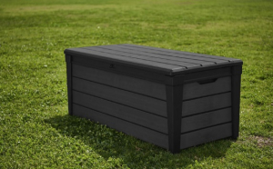 BAULE IN RESINA CON FINITURA EFFETTO LEGNO SPAZZOLATO, COPERCHIO CON PORTATA 300KG, PISTONI LATERALI PER APERTURA FACILITATA, LUCCHETTABILE - CM. 145x69,7x60,3h - 454 LT - GRAFITE