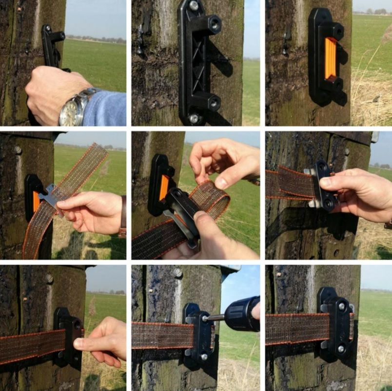 Isolatore d’ angolo, in plastica d’alta qualità, appositamente studiato per fissare il nastro tra due inserti in gomma (sistema brevettato), assicurandone una lunga durata. Utilizzare la piastra di collegamento in acciaio inossidabile per i pali di testa (cancello) in modo da garantire ottimi collegamenti elettrici.