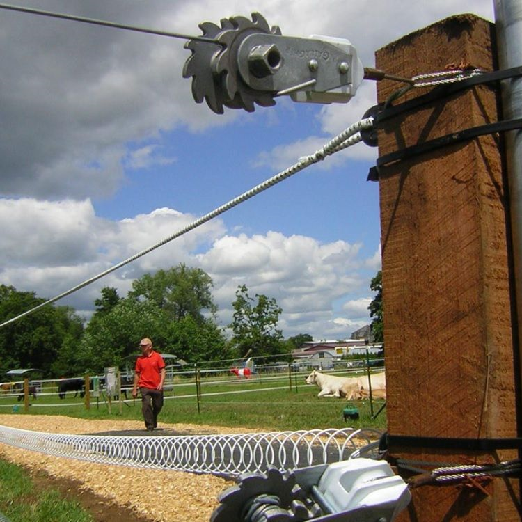 Isolatore di testa, già collegato ad un robusto cavo d’acciaio, che si installa in modo estremamente rapido al palo di trazione. Grazie al tenditore incorporato ed all’apposito attrezzo, permette anche di tendere il filo della recinzione. Indicato sia per il filo Equiwire che H.T.