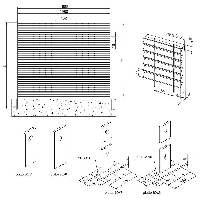 Le piantane sono costruite in piatto da 60 mm avente spessore 7 mm, dotate di opportune forature per il fissaggio dei pannelli. o Per il fissaggio dei pannelli alle rispettive piantane, è prevista una bulloneria