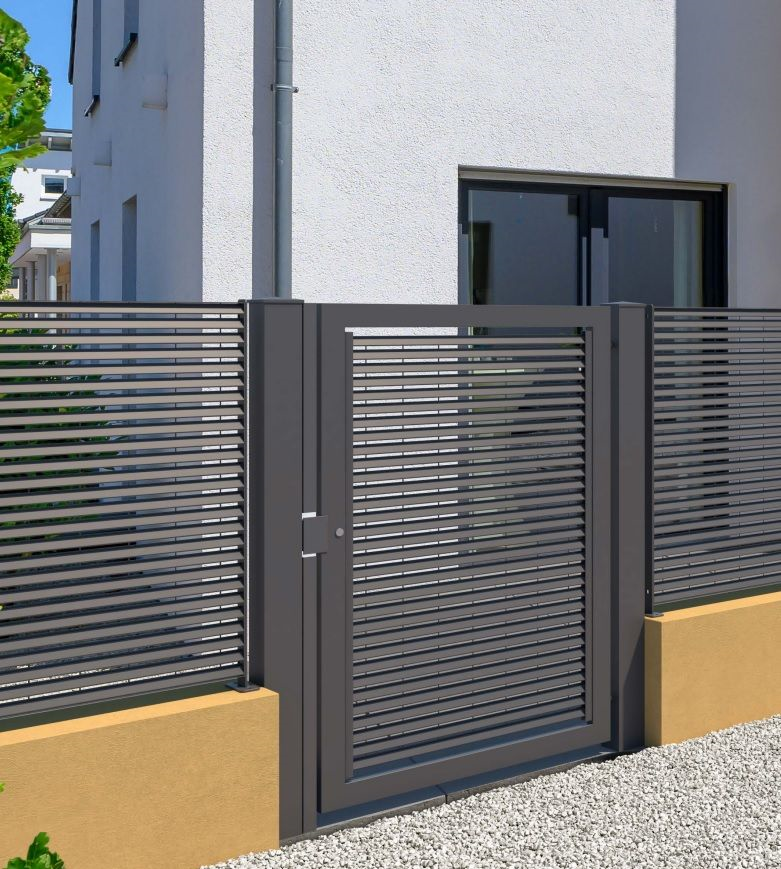 Le specchiature dei cancelli VENUS sono realizzate con profili orizzontali piegati a "Z". La proporzione ottimale tra pieni e vuoti garantisce un buon effetto oscurante, salvaguardando la leggerezza della soluzione.