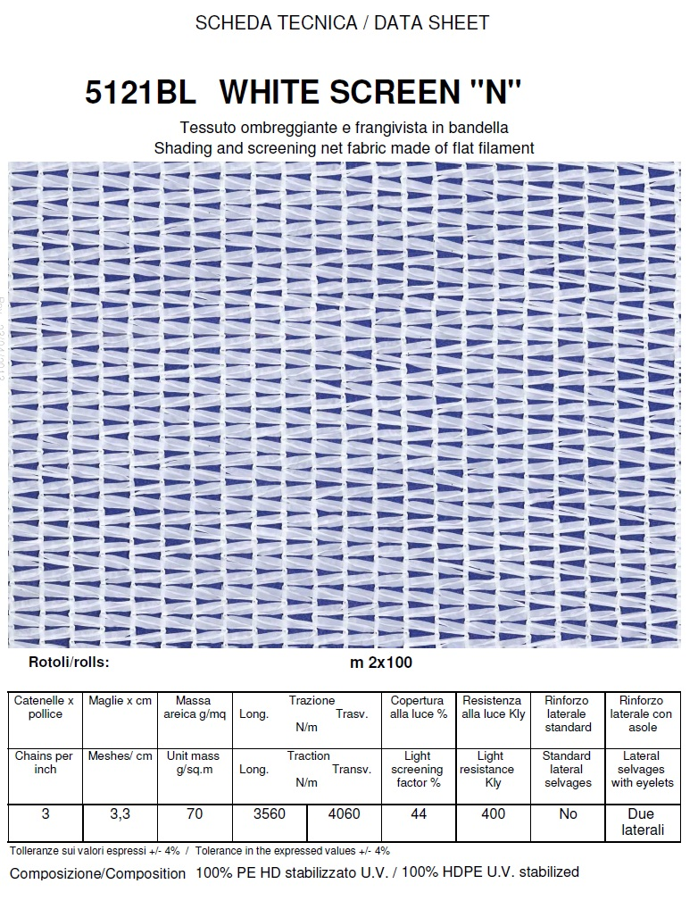 Tiene lontano occhi indiscreti e non attira insetti. E' trattata per resistere ai raggi UV e conserva, il suo colore originale resistendo a qualsiasi intemperie.In polietilene alta densità. Tessuta con schermatura del 90% Oltre ai normali impieghi per schermatura per recinzioni in rete metallica e modulari, grazie alla sua leggerezza, è utilizzato anche per realizzare pratiche verande per il campeggio