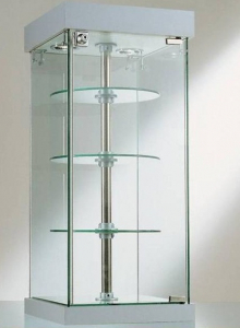 PRODUZIONE ITALIANA VETRINA DA BANCO Modello 201/RQ Vetri temperati - 2 faretti alogeni - movimento rotatorio con 3 ripiani Ø28cm. regolabili in altezza - base a specchio.