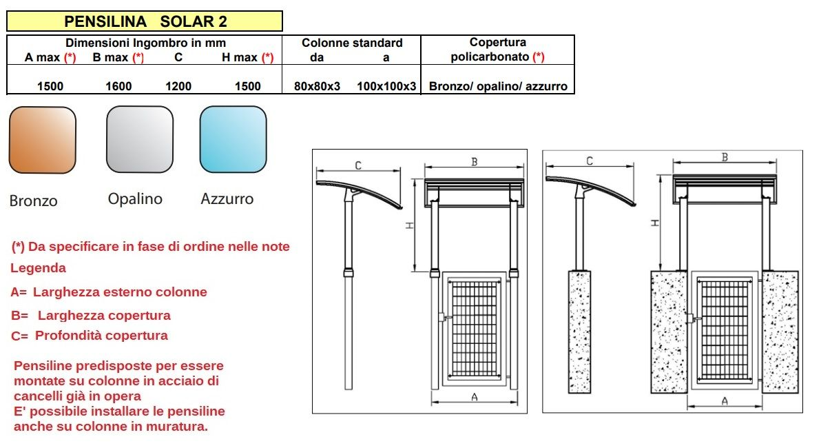 A : Larghezza esterno colonne ( cancello fino a 1500 mm ) con copertura larga fino a 1600 mm