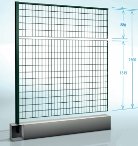 La recinzione in grigliato elettrosaldato modello per campi sportivi è composta da due pannelli. I due pannelli sono costruiti con profili orizzontali piatto 25x3 mm posti ad un interasse di 126 mm. I collegamenti sono costituiti da tondi Ø 4,5mm aventi interasse di 66mm. Le bordature verticali sono realizzate in piatto 25x3mm, dotate di opportune forature al fine di creare un supporto per il fissaggio alle piantane. Il pannello superiore e quello centrale sono rinforzati con un profilo a U 25x50x25 sp.3mm nella parte superiore.
