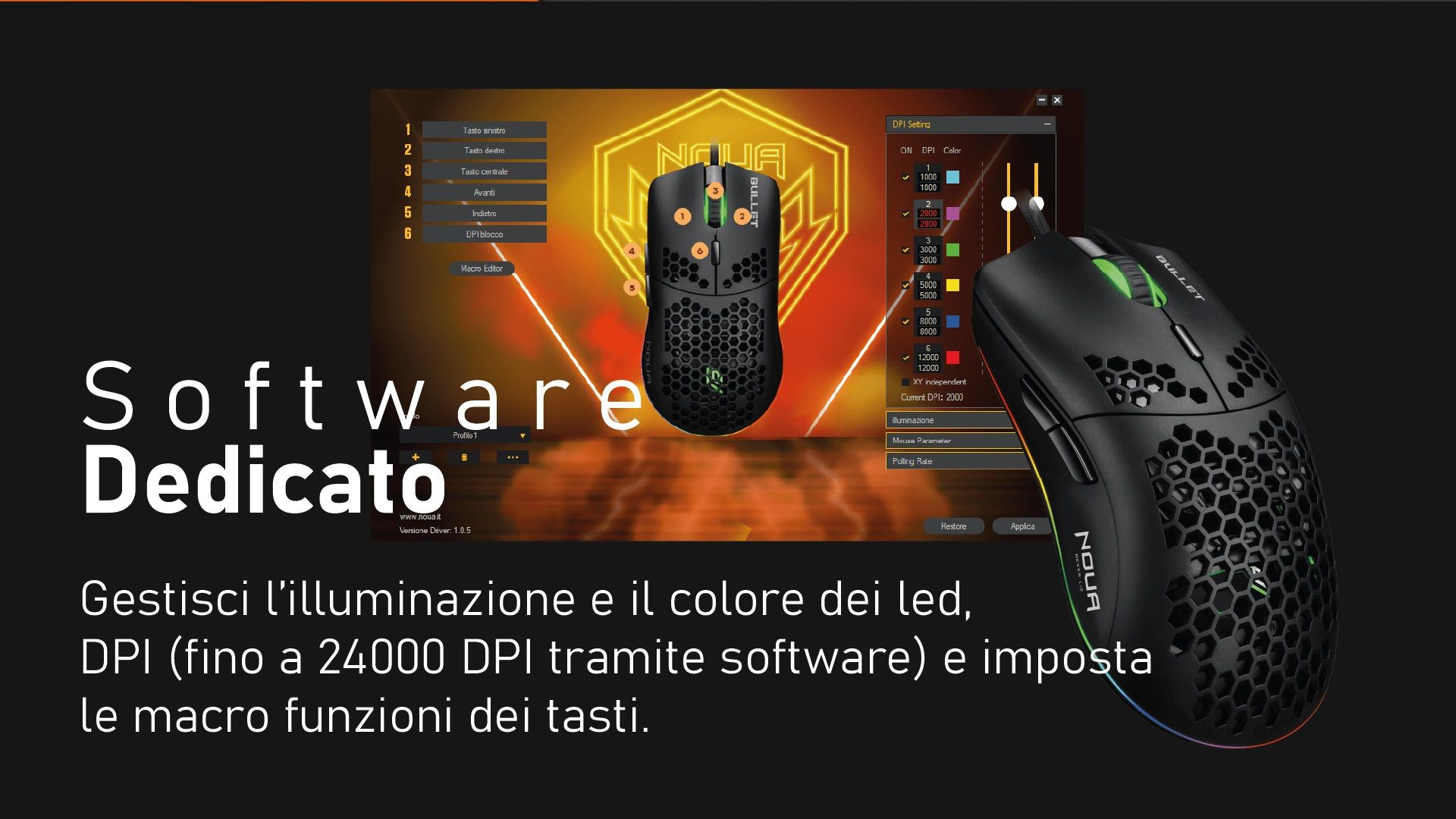 L'indicatore DPI dedicato può essere impostato su qualsiasi valore e colore scelto ( richiedere software per 2400dpi ), in modo da conoscere sempre il valore quando si regola al volo.