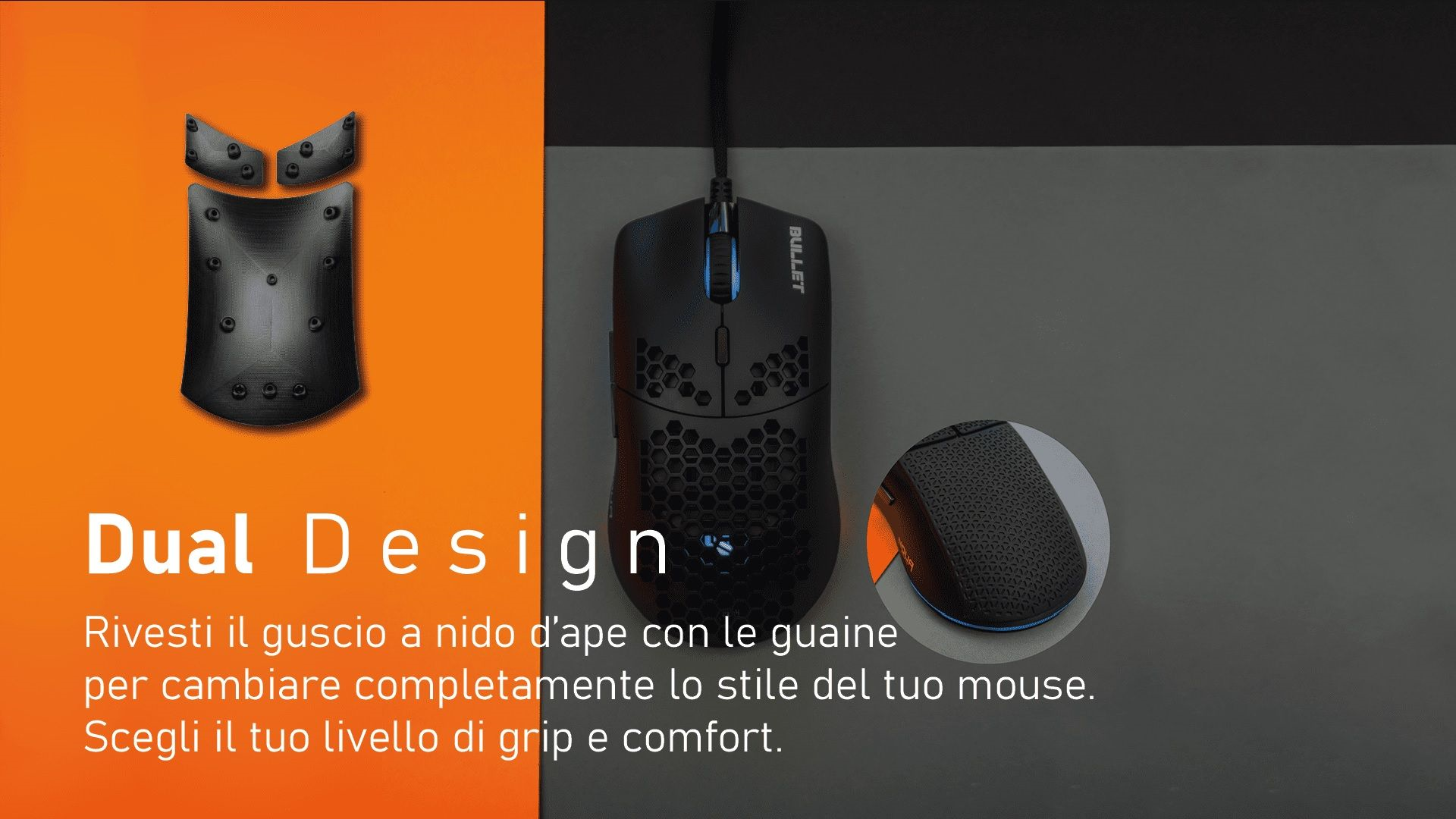 Il guscio a nido d'ape del mouse Bullet è la chiave per ottenere un peso piuma pur mantenendo la sua resistenza ultra durevole. Sentirai a malapena i fori durante il gioco, ma forniscono ventilazione per mantenere i palmi delle mani freschi. La pulizia del mouse è facile, basta usare una qualsiasi bomboletta d'aria per mantenere il mouse come nuovo.