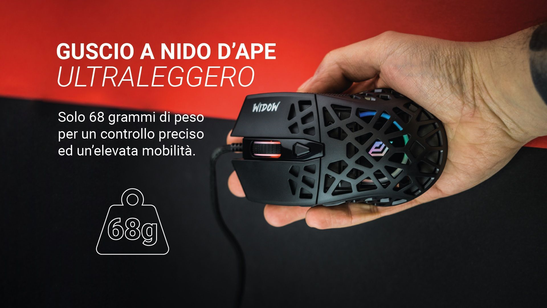 Il guscio a nido d'ape del mouse Widow è la chiave per ottenere un peso piuma pur mantenendo la sua resistenza ultra durevole. Sentirai a malapena i fori durante il gioco, ma forniscono ventilazione per mantenere i palmi delle mani freschi. La pulizia del mouse è facile, basta usare una qualsiasi bomboletta d'aria per mantenere il mouse come nuovo.