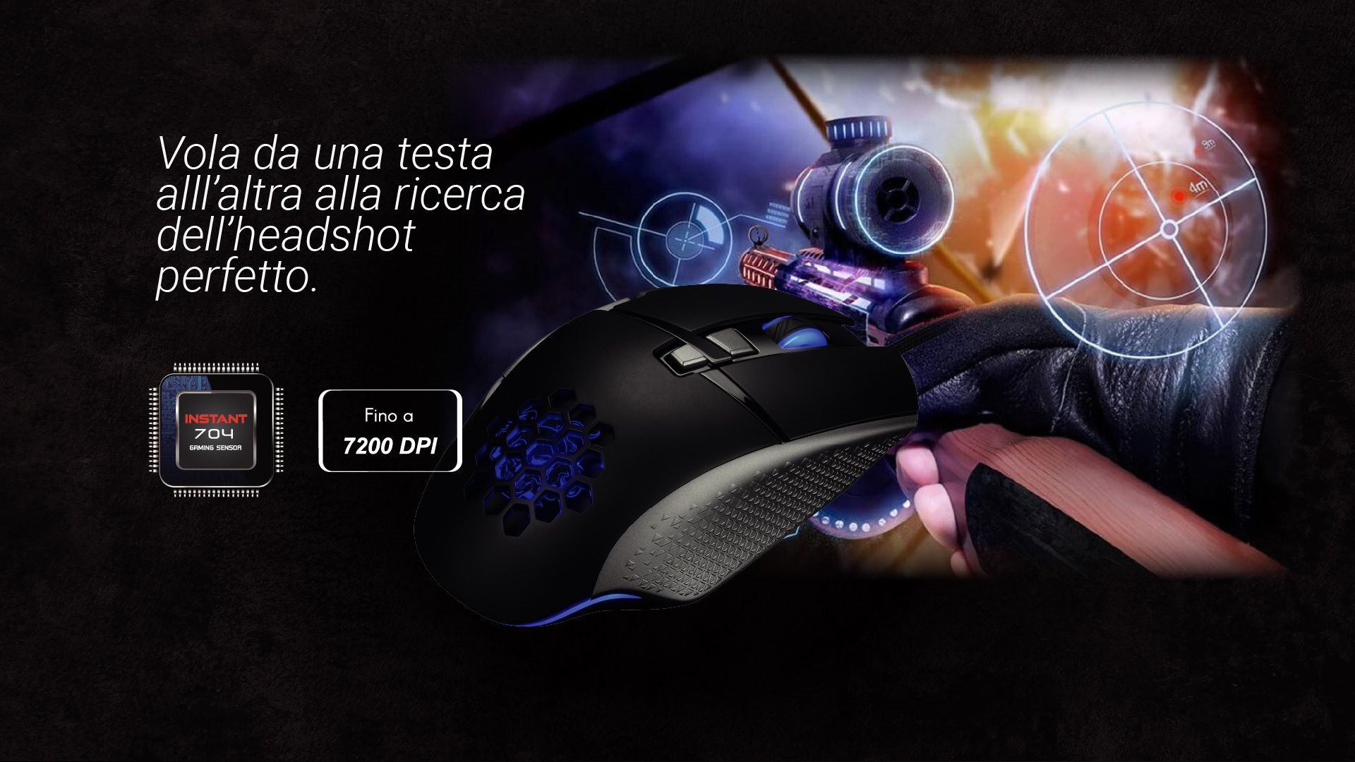 Sensore Ottico: Instant 704 Tracking Speed: 30ips Accelerazione: 8g Max.DPI: 7200 Min.DPI: 1200 Illuminazione: 4 Colori Numero di pulsanti: 8 Dimensioni Prodotto (L X P X A): 132 X 74 X 40 mm Dimensioni Scatolo (L X P X A): 215 X 160 X 65 mm Sistemi operativi supportati: Windows