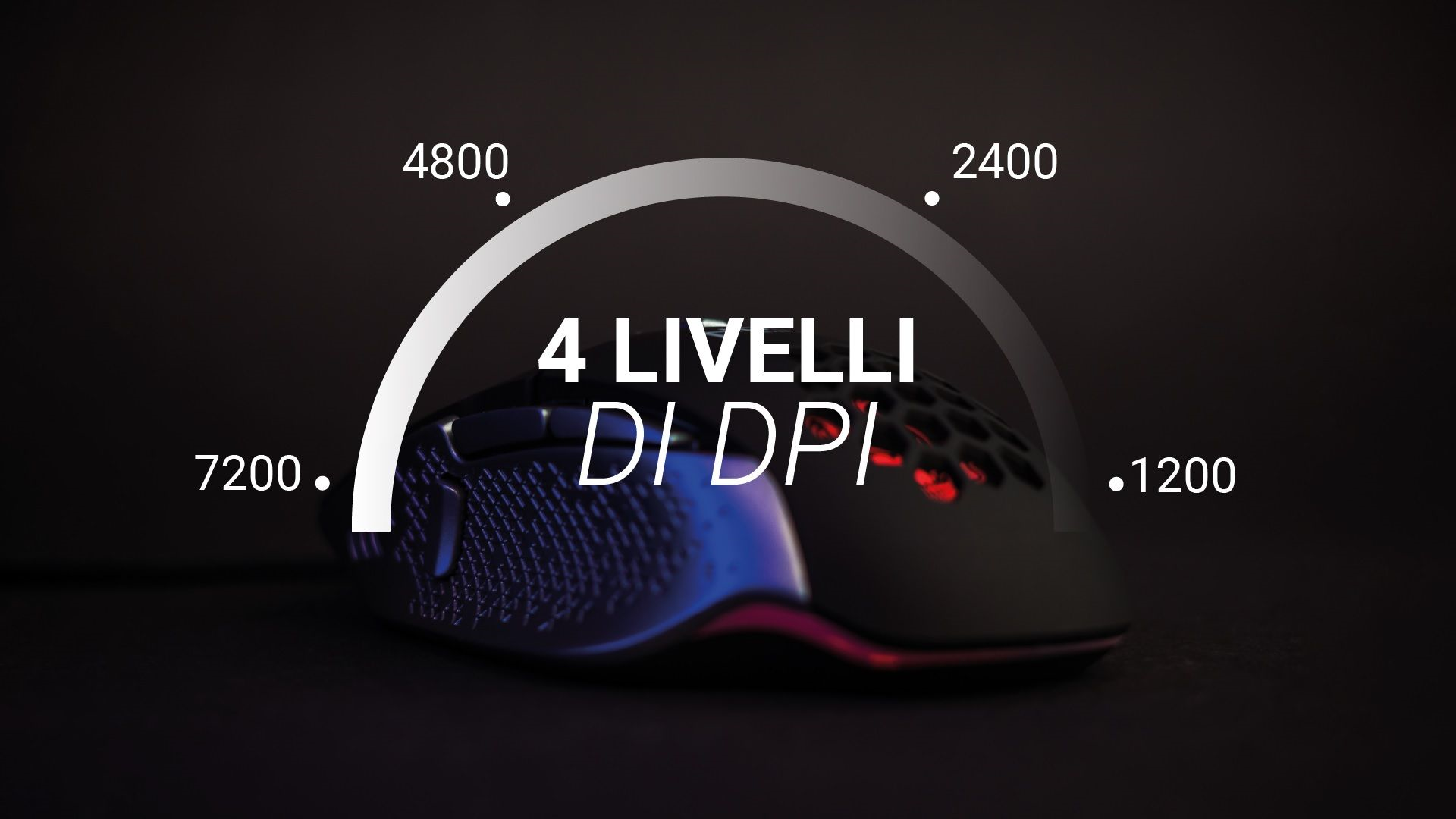 Livelli di DPI : 4 - (1200,2400,4800,7200) Colori di default livelli DPI: 1200 (blu), 2400 (rosa), 4800 (rosso), 7200 (viola) Tasto di regolazione DPI: SI Indicatore DPI: LED