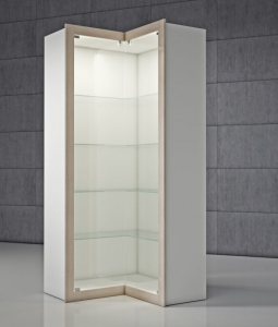 Vetrina angolare componibile con cornice decorativa in finitura bianco lucido , acero o palissandro su 3 lati.