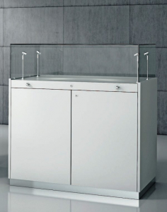 Vetrina Mobile legno con ante legno e 1 ripiano interno , piano estraibile e 4 faretti LED. Teca in cristallo incollato raggi UV apribile su un lato.