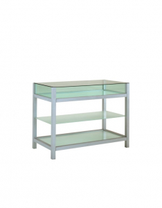 Ripiano Banco con struttura in legno , cristalli temperati , teca h 15 cm aperta su 1 lato lungo , 2 ripiani.