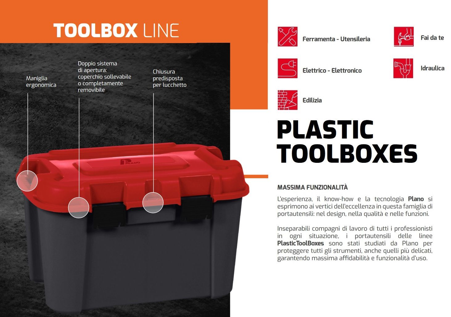 La cassetta/baule portautensili fa parte della linea Plano "Tollbox Line" è ideale come contenitore professionale per articoli di ferramenta, utensileria, elettrici, elettronici e per il fai da te. La Cassetta/baule porta attrezzi PLANO Apollo realizzata in polipropilene è dotata di doppio sistema di apertura con possibilità di rimuovere completamente il coperchio e 4 ruote per il trasporto facile.
