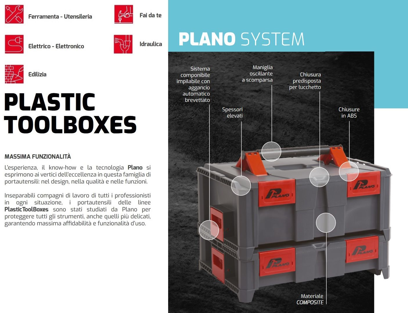 La cassetta Portautensili fa parte della Plano "System Line" è ideale come contenitore professionale per articoli di ferramenta, utensileria, elettrici, elettronici e fai da te. La cassetta porta attrezzi componibile PLANO System-System 1 realizzato in polipropilene, è dotato di un particolare aggancio brevettato automatico.